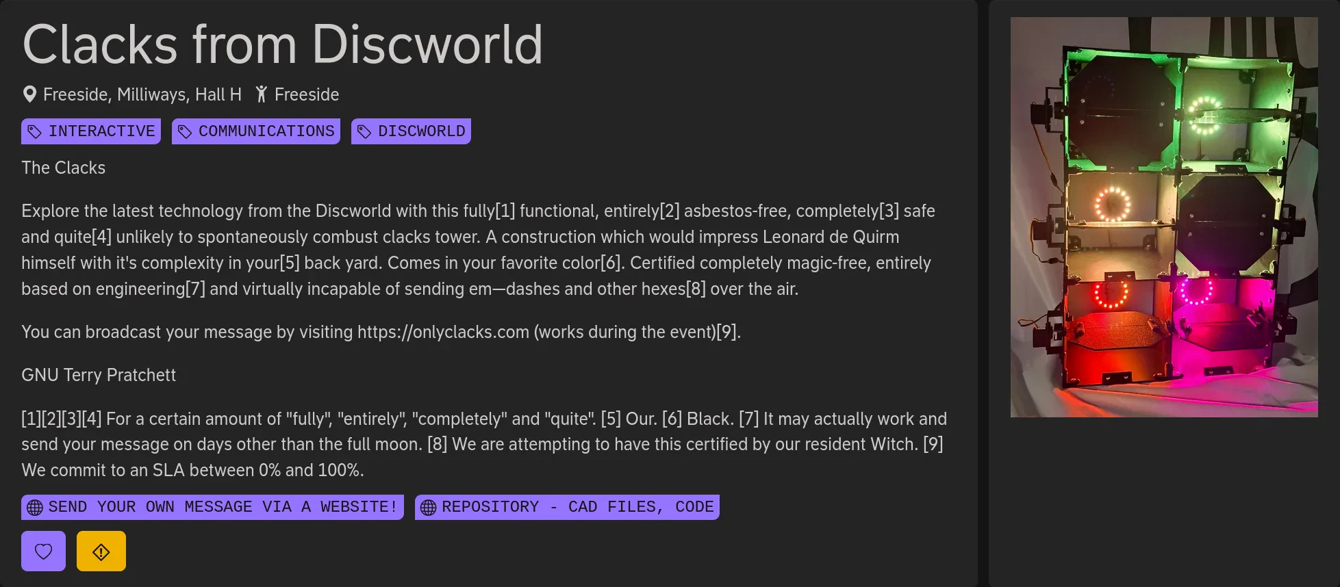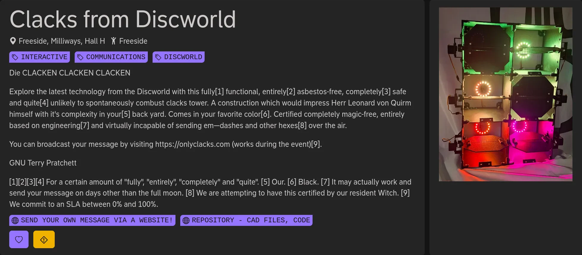 Clacks were spontaneously proposed by a friend as a project for 39c3 when I was looking for something to work on for the event. I right away thought it was a great fit: it blinks, it moves, it makes noise and it's interactive. On top of all that, we are both fans of Sir Terry Pratchett and were excited to see a Discworld project at congress.